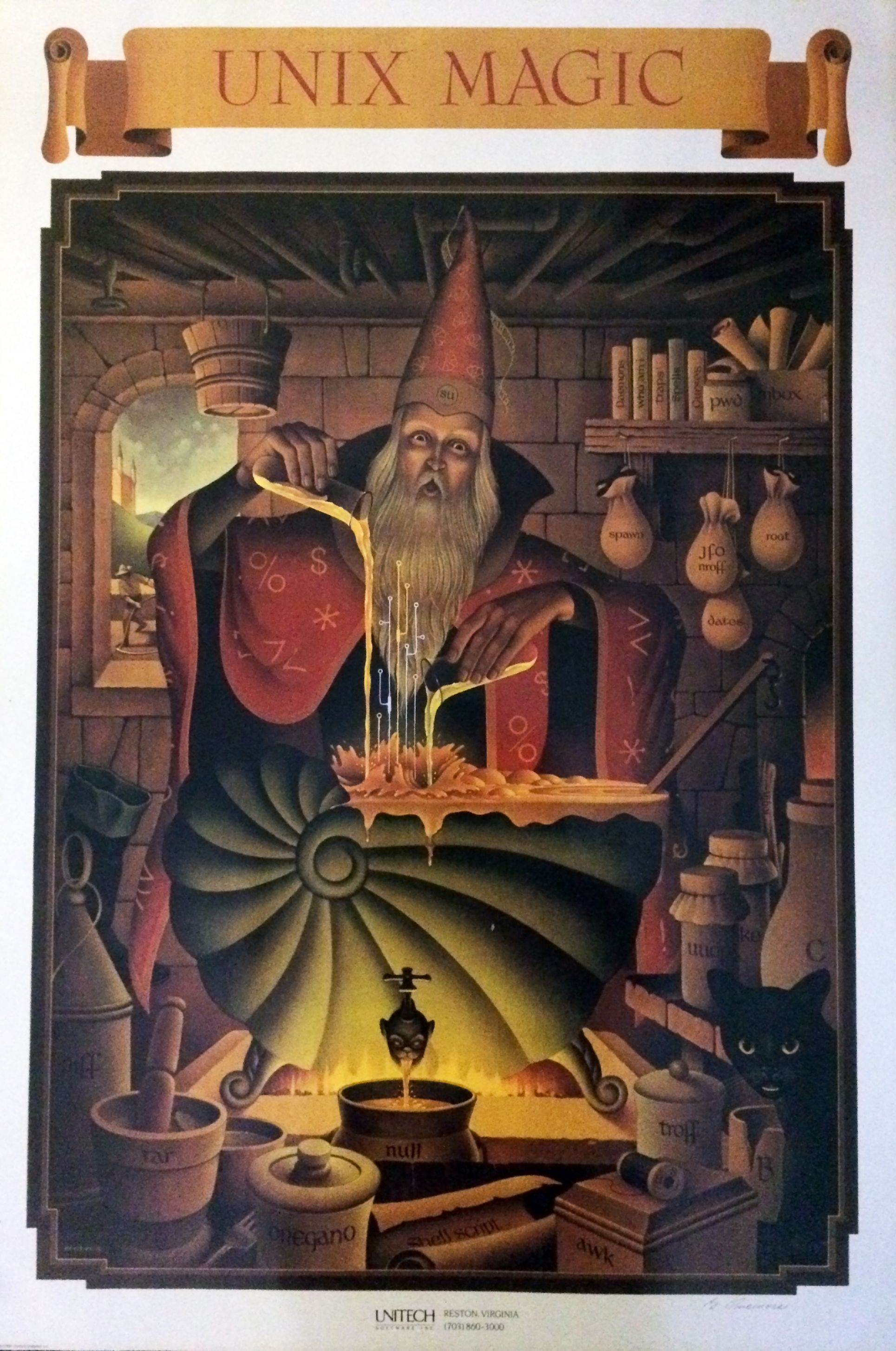 Unix Magic poster, a wizard crafting a potion surrounded by ingredients named after Unix tools