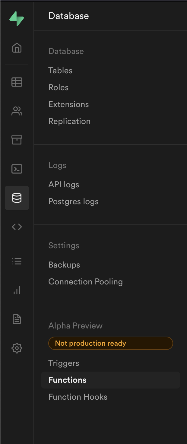 4. Now, we need to add a stored procedure (AKA a stored SQL function we can call from the Supabase API). Navigate to the `Database` tab in the left nav bar and select the `Functions` menu item inside: